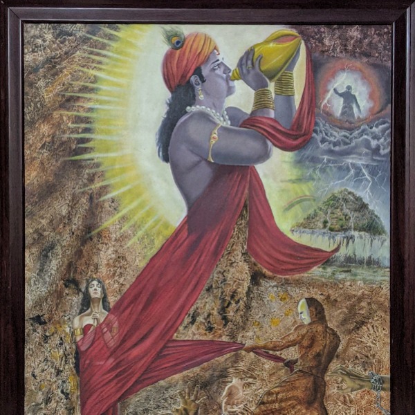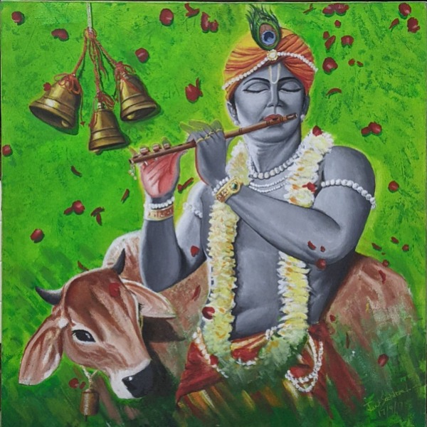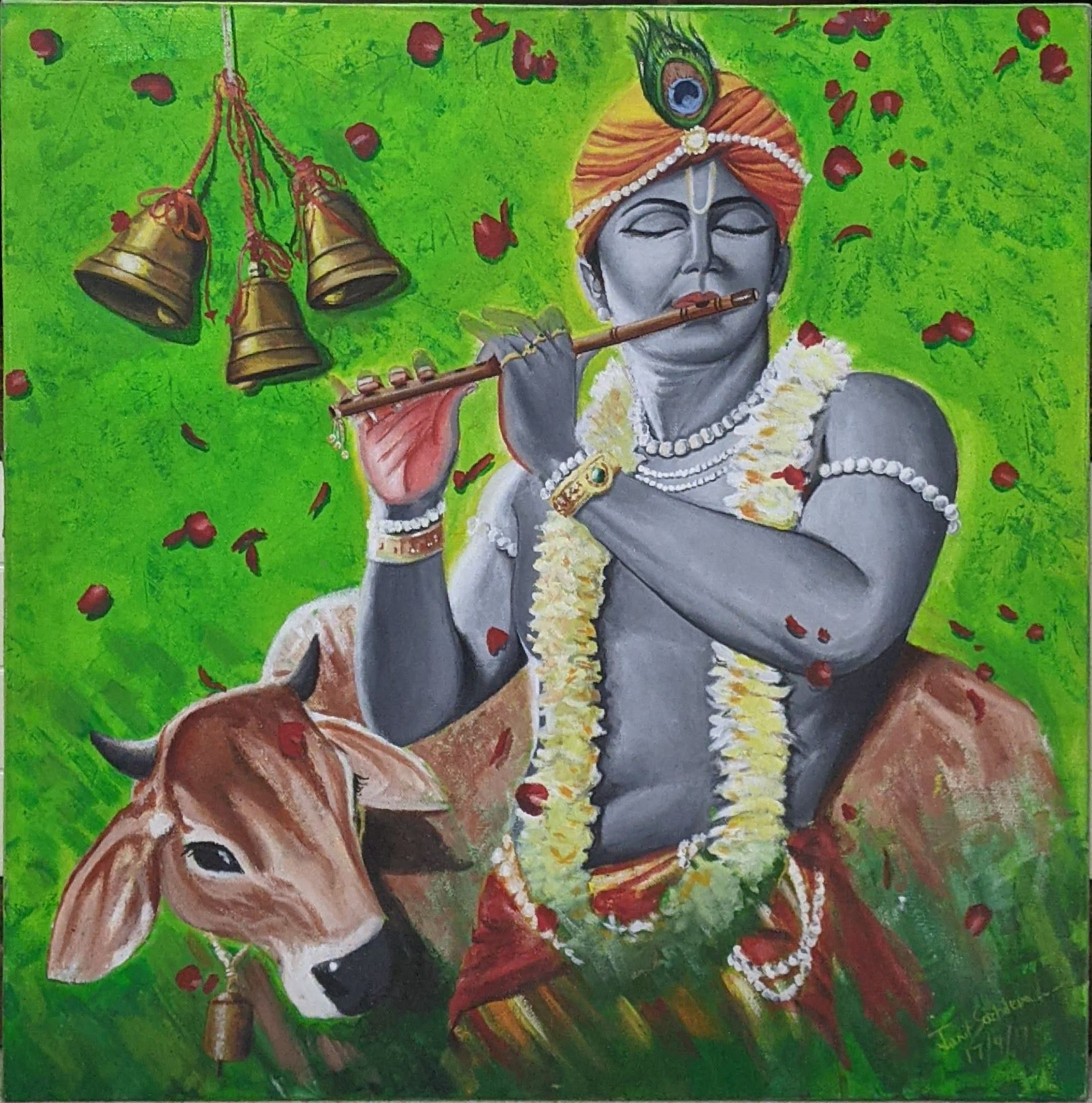Beautiful and Vibrant Krishna painting specially designed to bring peace to the environment. A serene and beautiful pose of Krishna playing Flute as a cowherd in trance.
